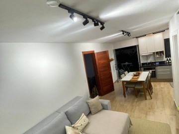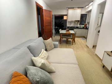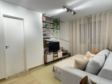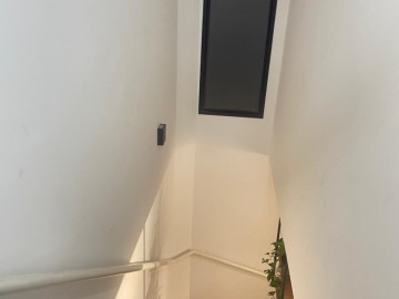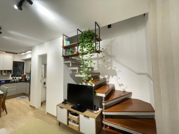 Ao entrar, a sensação de aconchego se confirma: uma charmosa porta de madeira dá acesso à sala de estar, e uma ampla porta de vidro na cozinha convida o olhar para o quintal, integrando os ambientes com luz natural e vida. A cozinha conta com móveis planejados, piso em porcelanato amadeirado que traz sofisticação, e a escada, com degraus revestidos em madeira, completa o clima acolhedor.