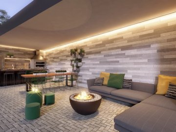 O prédio possui vagas individuais e demarcadas, Arena Beach Tênis, vagas para carregar carros elétricos, piscina semiolímpica aquecida, portaria com reconhecimento facial, preparação para ar condicionado, fechadura digital, Alexa com controle de infravermelhos, academia, brinquedoteca, quiosque, churrasqueira a carvão, salão de festas com living e churrasqueira, espaço delivery, playground e lavanderia OMO. Há 2 torres com térreo mais 10 pavimentos contendo 88 unidades, com 2 elevadores por torre.