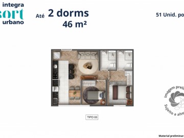 • 2 dormitórios - 46 m² (51 unidades por torre);